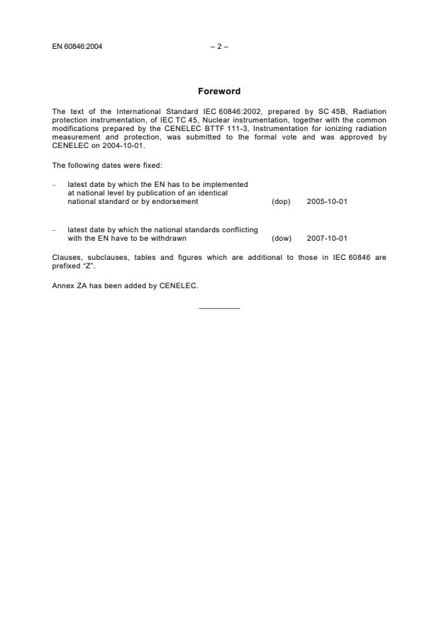 EN 60846:2004 is a standard published by CLC. Its full title is "Radiation protection instrumentation - Ambient and/or directional dose equivalent (rate) meters and/or monitors for beta, X and gamma radiation". This standard covers: Specifies the design requirements and the performance characteristics of dose equivalent (rate) meters intended for the determination of ambient dose equivalent (rate) and directional dose equivalent (rate) as defined in ICRU Report 47.