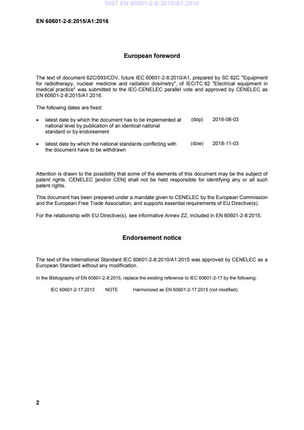 This amendment A1 modifies the European Standard EN 60601-2-8:2015; it was approved by CENELEC on 2015-11-03. CENELEC