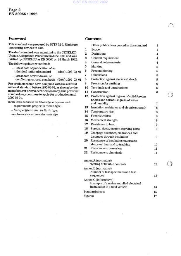 EN 50066:1992 is a standard published by CLC. Its full title is "Mini-couplers for the interconnection of electrical mains supplied equipment in road vehicles". This standard covers: This standard specifies general safety requirements for mini-couplers with a rated current of 16 A and a rated voltage of 250 V a.c. single phase, applies for the interconnection of mains supplied equipment in road vehicles e.g. to supply electrical heaters, battery chargers and cab heaters. This standard may also be used for mini-couplers for other similar applications. The standard does not apply to devices used in flexible supply cables for the connection of household electrical appliances and the like to their supply. The introduction of requirements for mini-couplers for 440 V three phase is under consideration. It should borne in mind that aspects of product liability will have to be considered in conjunction with the use of mini-couplers