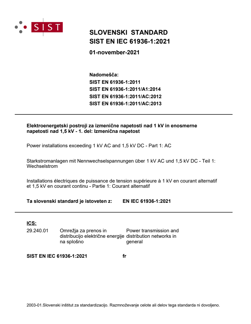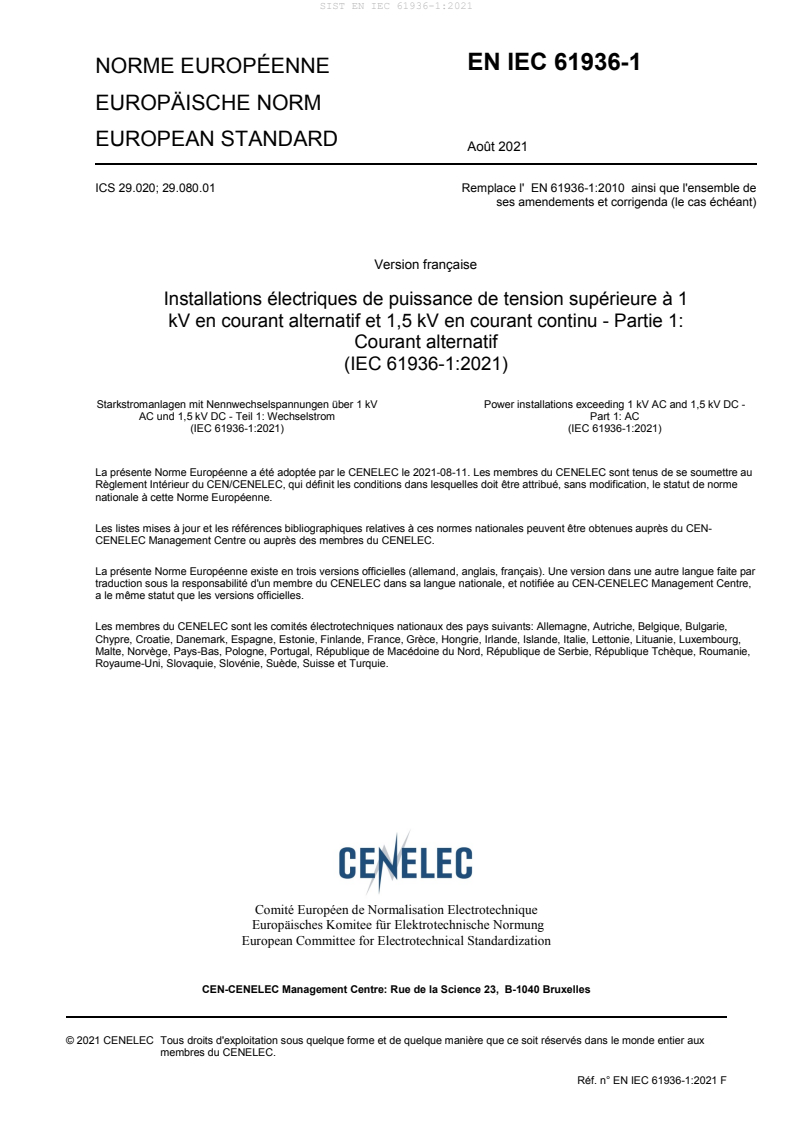 EN IEC 61936-1:2021 (IEC 61936-1:2021) is the European adoption of the international standard that defines requirements for the design and erection of high‑voltage (HV) power installations. It applies to electrical power installations with nominal AC voltages exceeding 1 kV (and nominal DC voltages above 1.5 kV for interpretative purposes) and nominal frequencies up to and including 60 Hz. The standard addresses safety and correct functioning for intended use across substations, power stations, outdoor switchgear, industrial electrical systems, offshore generation and transition towers/poles.