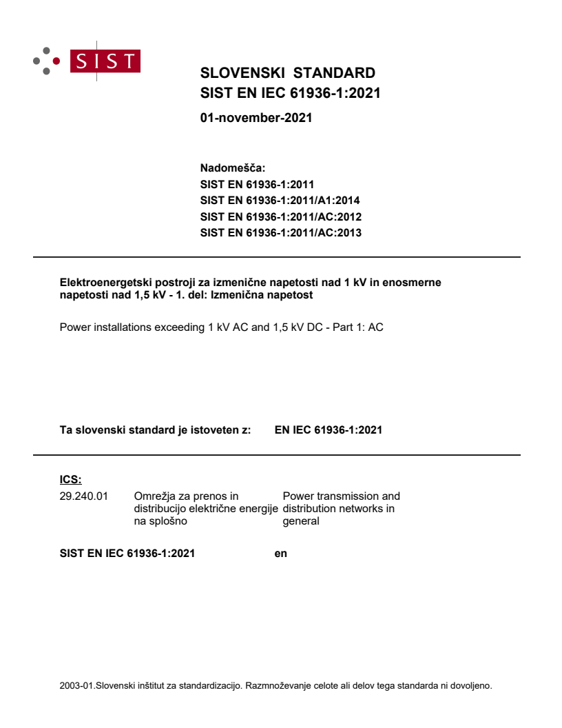 Elektroenergetski postroji za izmenične napetosti nad 1 kV in enosmerne napetosti nad 1,5 kV - 1. del: Izmenična napetost