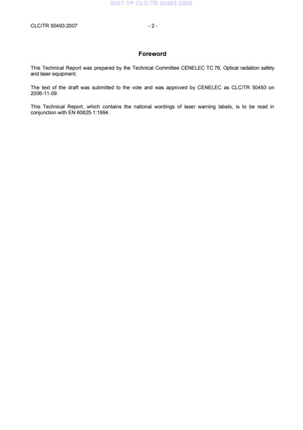 CLC/TR 50493:2007 is a technical report published by CLC. Its full title is "National wordings of laser warning labels". This standard covers: This Technical Report contains the national wordings of laser warning labels to be read in conjunction with EN 60825-1:1994.