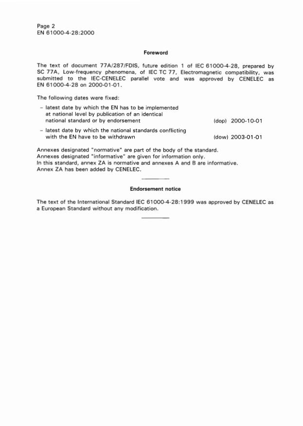 EN 61000-4-28:2000 (CLC adoption of IEC 61000-4-28) is a basic EMC publication that defines a standardized immunity test for variation of the power frequency. It establishes reference test methods and levels for evaluating the ability of electrical and electronic equipment to withstand conducted power-frequency variations on 50 Hz or 60 Hz networks for equipment with input current not exceeding 16 A per phase. The standard covers conducted phenomena only (public and industrial networks) and excludes 400 Hz systems.