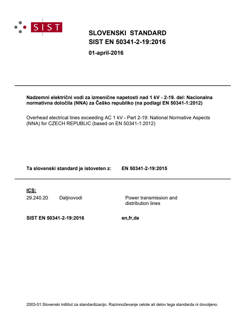 Nadzemni električni vodi za izmenične napetosti nad 1 kV - 2-19. del: Nacionalna normativna določila (NNA) za Češko republiko (na podlagi EN 50341-1:2012)