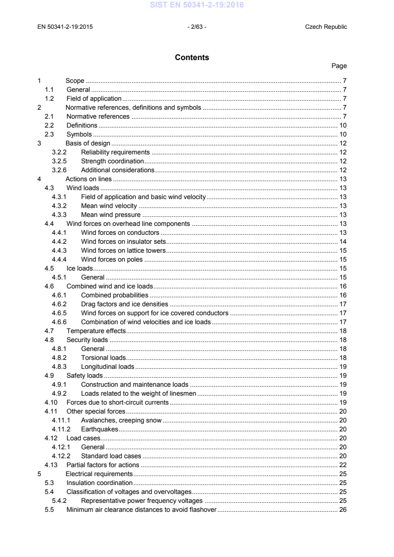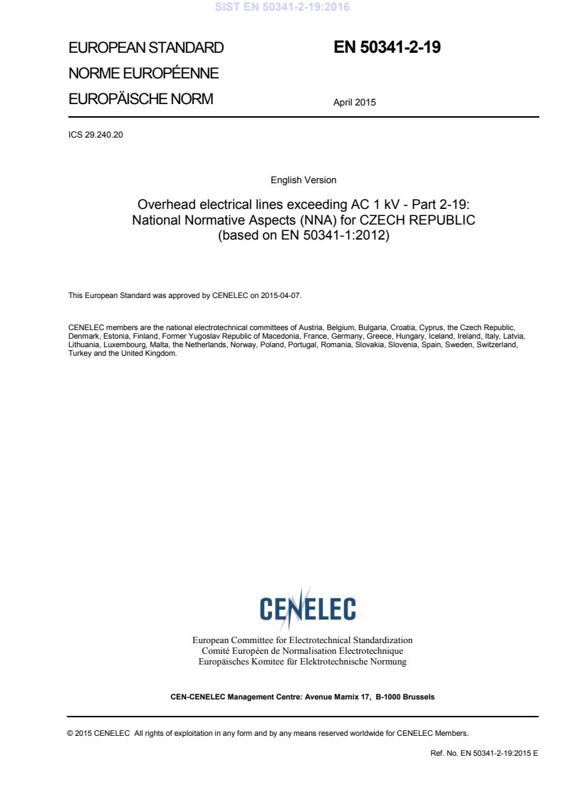 EN 50341-2-19:2015 is a standard published by CLC. Its full title is "Overhead electrical lines exceeding AC 1 kV - Part 2-19: National Normative Aspects (NNA) for CZECH REPUBLIC (based on EN 50341-1:2012)". This standard covers: 1.1 General (ncpt) CZ.1 New overhead line The new overhead line is considered a brand new electric overhead line with nominal voltage exceeding 1 kV AC, between the points A and B. The new branch line of the existing overhead line shall be considered a new overhead line except for a junction support for which the specific requirements shall be defined in the Project Specification. The extent of application of this standard in respect of reconstruction, relaying and extension of existing overhead lines shall be determined in the Project Specification. Simultaneously, the Project Specification shall determine, which of the previous national standards shall be used and to what extent they shall be used for the project in question. 1.2 Field of application (ncpt) CZ.1 Field of application The requirements of this standard shall be adopted, where applicable (e.g. requirements on loads, external clearances, etc.), for telecommunication cables as well. In case of overhead line under the design stage, parties concerned shall agree the extent of the application of this standard. Overhead line under construction may be completed according to standards valid during the design stage of the line. The parties concerned shall agree any possible application of certain clauses of this standard. (ncpt) CZ.2 Installation of telecommunication equipment on supports Provisions of this standard also apply to the telecommunication equipment and devices (aerials, dish antennas, etc.) which are installed on individual supports of overhead power lines, especially in terms of wind and ice loads on such installed equipment. Design and installation has to respect requirements of the utility operating the line in question. The design of such telecommunication equipment has to incorporate such technical solutions and such precautions, which shall allow safe access and maintenance of both a power line and telecommunication equipment, and which shall provide protection of persons performing repairs or maintenance of the power line and/or telecommunication equipment against electric shock and protection of telecommunication equipment and attached installations against the influence of the power line (short-circuits, switching and lightning overvoltages etc.).