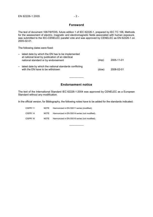 EN 62226-1:2005 is a standard published by CLC. Its full title is "Exposure to electric or magnetic fields in the low and intermediate frequency range - Methods for calculating the current density and internal electric field induced in the human body - Part 1: General". This standard covers: Provides means for demonstrating compliance with the basic restrictions on human exposure to low and intermediate frequency electric and magnetic fields specified in exposure standards or guidelines such as those produced by IEEE and ICNIRP. The object of EN 62226 is - to propose a more realistic approach to the modelling of the human exposure to low frequency electric and magnetic fields, using a set of models of growing complexity for the field emission source, or the human body or both; - to propose standardised values for the electrical parameters of organs in human body: electrical conductivity and permittivity and their variation with the frequency. The present basic standard does not aim at replacing the definitions and procedures specified in exposure standards or guidelines, such as those produced by IEEE or ICNIRP, but aims at providing additional procedures with a view to allowing compliance assessment with these documents. The present basic standard provides means for demonstrating compliance with the basic restrictions without having to go to the sophisticated models. Nevertheless, when the exposure conditions are well characterized (such as in product standards, for example) and when results from such models are available, they can be used for demonstrating compliance with EMF standards or guidelines.