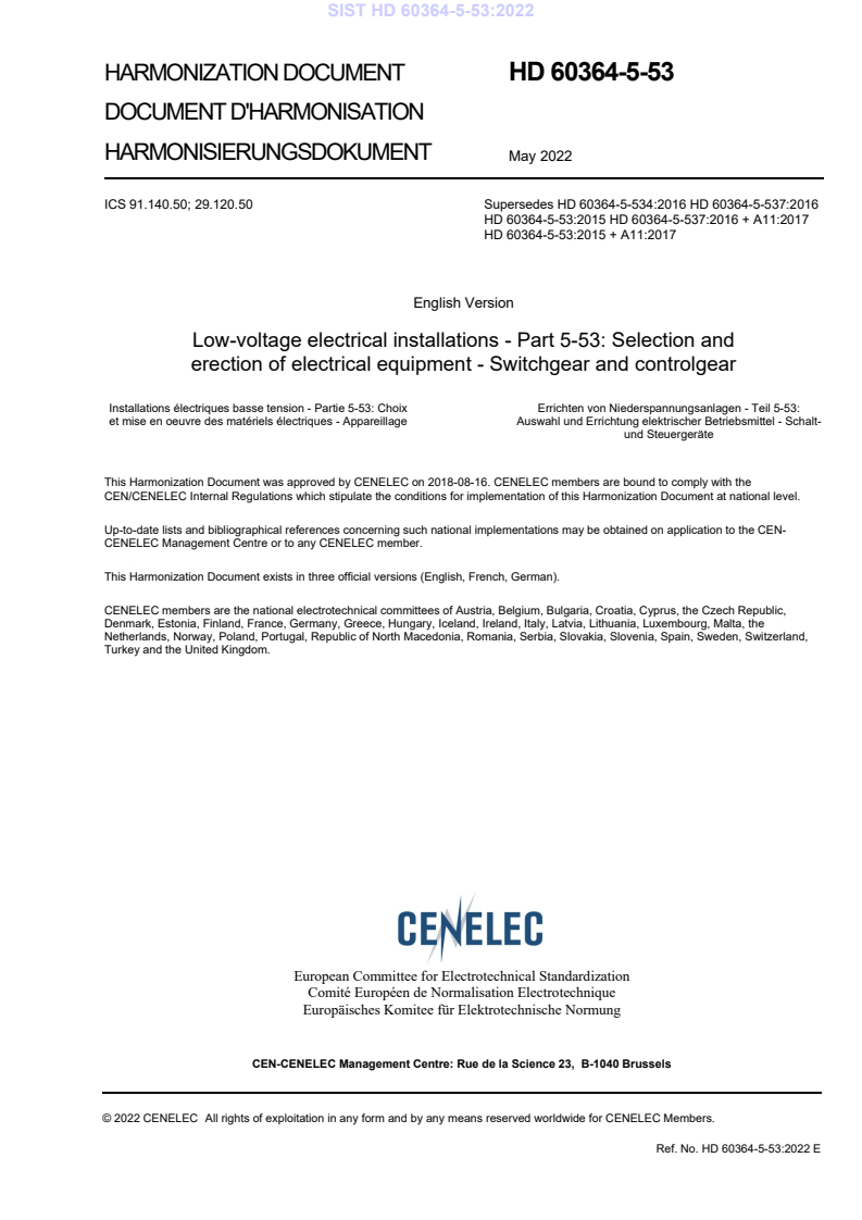 HD 60364-5-53:2022 - Low-voltage electrical installations: Selection and erection of electrical equipment - Switchgear and controlgear is a CENELEC harmonization document that sets out general requirements for the selection, installation and arrangement of switchgear and controlgear used in low-voltage electrical installations. It covers the essential functions of isolation, switching, control and monitoring, provides terms and definitions, and describes co‑ordination principles needed to ensure safety and continuity of service. This edition (2022) supersedes earlier HD 60364-5-53 and related parts and was prepared by CLC/TC 64.