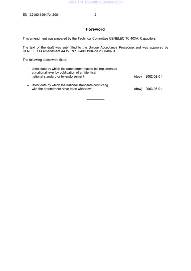 EN 132400:1994/A4:2001 is a amendment published by CLC. Its full title is "Sectional Specification: Fixed capacitors for electromagnetic interference suppression and connection to the supply mains (Assessment level D)". This standard covers: Superseded by EN 60384-14:2005
