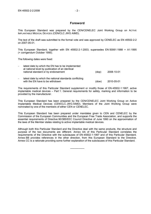 2010-05-01 The requirements of this Particular Standard supplement or modify those of EN 45502-1:1997, active implantable medical devices – Part 1: General requirements for safety, marking and information to be provided by the manufacturer. This European Standard has been prepared by the CEN/CENELEC Joint Working Group on Active Implantable Medical Devices (CEN/CLC JWG AIMD). Members of the Joint Working Group were nominated by one of the members of either CEN or CENELEC. This European Standard has been prepared under mandates given to CEN and CENELEC by the Commission of the European Communities and the European Free Trade Association, and supports the essential requirements of Directive 90/385/EEC Council Directive of June 1990 on the approximation of the laws of the Member states relating to active implantable medical devices. Although both this Particular Standard and the Directive deal with the same products, the structure and purpose of the two documents are different. Annex AA of this Particular Standard correlates the requirements of the Directive with the subclauses of EN 45502-1:1997 and of this Particular Standard. Annex BB provides references in the other direction, from this European Standard to the Directive. Annex CC is a rationale providing some further explanation of the subclauses of this Particular Standard. __________