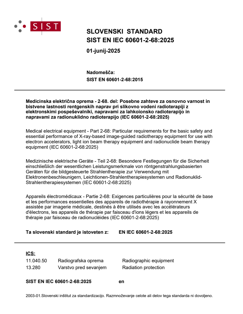 Medicinska električna oprema - 2-68. del: Posebne zahteve za osnovno varnost in bistvene lastnosti rentgenskih naprav pri slikovno vodeni radioterapiji z elektronskimi pospeševalniki, napravami za lahkoionsko radioterapijo in napravami za radionuklidno radioterapijo (IEC 60601-2-68:2025)