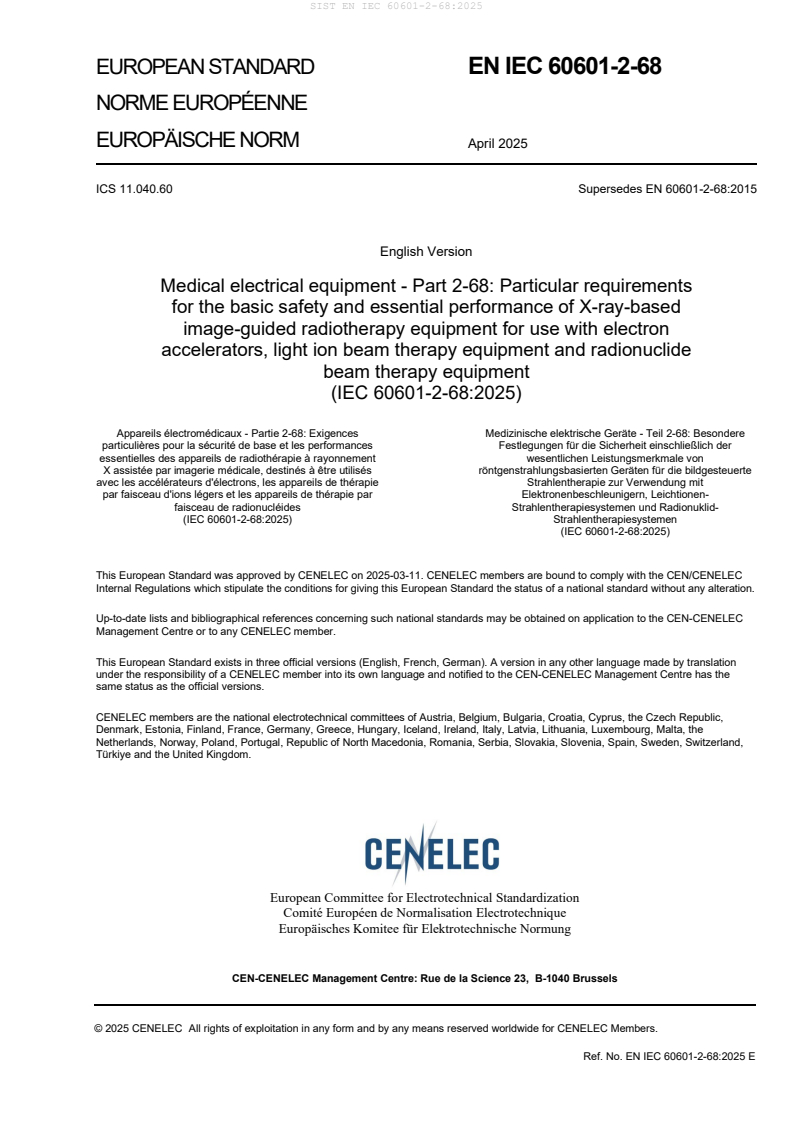 EN IEC 60601-2-68:2025 is a standard published by CLC. Its full title is "Medical electrical equipment - Part 2-68: Particular requirements for the basic safety and essential performance of X-ray-based image-guided radiotherapy equipment for use with electron accelerators, light ion beam therapy equipment and radionuclide beam therapy equipment". This standard covers: IEC 60601-2-68:2025 applies to the BASIC SAFETY and ESSENTIAL PERFORMANCE of X-ray based IMAGE-GUIDED RADIOTHERAPY equipment for use with EXTERNAL BEAM EQUIPMENT (EBE). This document covers safety aspects of kilovoltage (kV) and megavoltage (MV) X-ray imaging devices integrated in a specified geometrical relationship with EBE for the purpose of IGRT. It covers aspects of communication and relationships between the EXTERNAL BEAM EQUIPMENT and X-ray imaging devices, attached or not directly attached to, but in the same RADIATION shielded area as, and dedicated for use only with, the EXTERNAL BEAM EQUIPMENT. This document deals with equipment for OFFLINE X-IGRT, ONLINE X-IGRT and REAL-TIME X-IGRT. It covers procedures to reduce the risk of over-reliance on the X-IGRT EBE SYSTEM. For example, in the case of ONLINE X-IGRT, the MANUFACTURER will provide an interactive interface for user interaction with the correction suggested by the system. This document does not apply to CT SCANNERS, X-RAY EQUIPMENT for RADIOGRAPHY, and X-RAY EQUIPMENT for RADIOSCOPY, which are not intended for use for IGRT. Requirements that are being tested according to another standard can be identified by the manufacturer and if equivalent do not require retesting, instead evidence can refer to the CT SCANNER, X-RAY EQUIPMENT for RADIOGRAPHY, or X-RAY EQUIPMENT for RADIOSCOPY EQUIPMENT manufacturer's providing compliance statements or test reports. If the X-IGRT EQUIPMENT is combined with an MEE, any requirement that is the same for the X-IGRT EQUIPMENT and the MEE, such as a PATIENT POSITIONER, is not required to be tested twice, but can be accepted as tested by the MEE. This document applies for X-ray equipment for radiography, radioscopy, and COMPUTER tomography used for IGRT. If a clause or subclause is specifically intended to be applicable to X-IGRT EBE SYSTEMS, the content of that clause or subclause will say so. Where that is not the case, the clause or subclause applies only to X-IGRT EQUIPMENT. This document, with the inclusion of TYPE TESTS and SITE TESTS, applies respectively to the MANUFACTURER and some installation aspects of X-IGRT EBE SYSTEMS intended to be: • for NORMAL USE, operated under the authority of the RESPONSIBLE ORGANIZATION by QUALIFIED PERSONS having the required skills for a particular medical application, for particular specified clinical purposes, e.g., STATIONARY RADIOTHERAPY or MOVING BEAM RADIOTHERAPY, • maintained in accordance with the recommendations given in the INSTRUCTIONS FOR USE, and • subject to regular quality assurance performance and calibration checks by a QUALIFIED PERSON. IEC 80601-2-68:2024 cancels and replaces the first edition published in 2014. This edition constitutes a technical revision. This edition includes the following significant technical changes with respect to the previous edition: a) alignment with the new editions of the relevant standards: – IEC 60601-2-1:2020; – IEC 60601-2-44:2009, IEC 60601-2-44:2009/AMD1:2012 and IEC 60601-2-44:2009/AMD2:2016; – IEC 60601-2-64:2014; b) clarification of the use of IEC 60601-2-68 for CT SCANNERS, X-RAY EQUIPMENT for RADIOGRAPHY and RADIOSCOPY used in the same room with an EXTERNAL BEAM EQUIPMENT (EBE); c) introduction of updated requirements related to MECHANICAL HAZARDS, RADIATION HAZARDS, PROGRAMMABLE ELECTRICAL MEDICAL SYSTEMS (PEMS), ACCOMPANYING DOCUMENTATION of an ME SYSTEM, and REMOTE OPERATION.