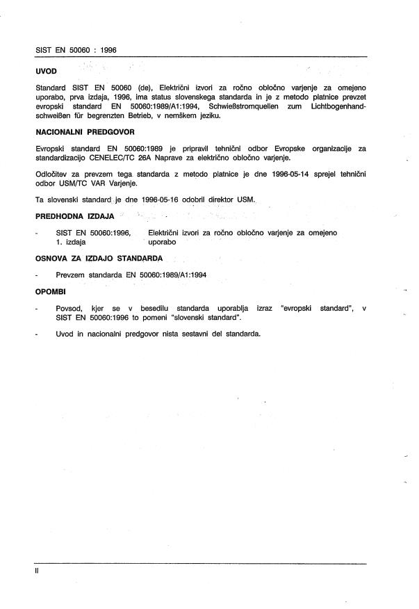 EN 50060:1989 is a standard + national annex and/or foreword published by CLC. Its full title is "Power sources for manual metal arc welding with limited duty". This standard covers: This standard is applicable to welding power sources for manual metal arc welding with limited duty with covered stick electrodes. These welding power sources a) are limited to a rated maximum welding current of 160 A; b) are fitted with a thermal cut-out device; c) have performance based on the number of reference electrodes, capable of being melted with the welding power source in the cold and hot state and d) carry on their rating plate a declaration of the fuse size necessary for the maximum output. This standard is not applicable to rotating welding power sources or welding power sources with remote control or welding power sources incorporating frequency conversion. Note.- Inverter type welding power sources are excluded from this standard on the grounds that a) there are not yet available methods to test the safety of them b) they cause considerable harmonic distortions to the supply.