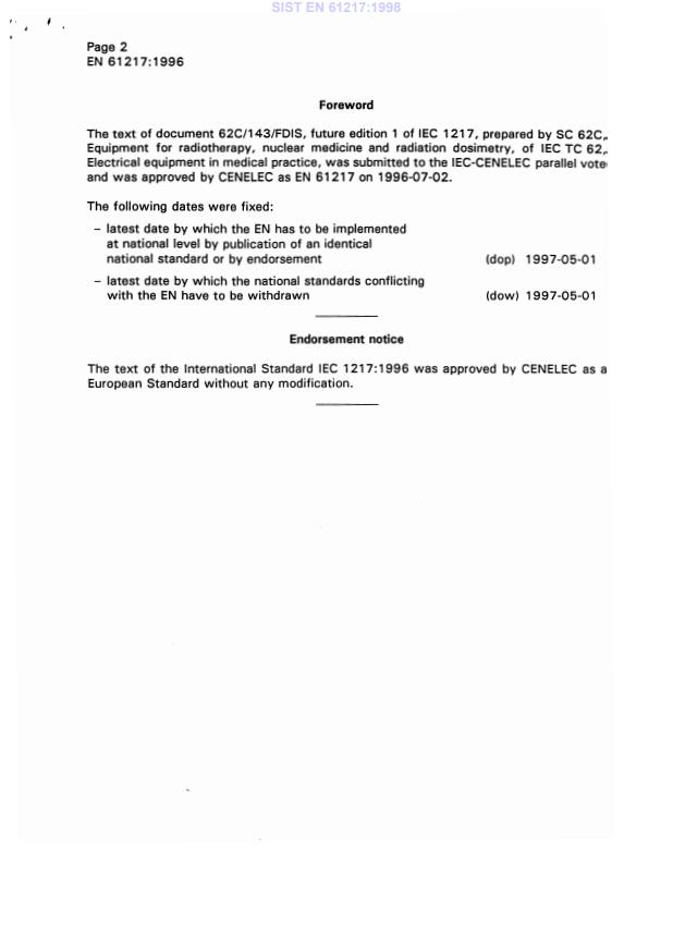 EN 61217:1996 has the following relationships with other standards: It is inter standard links to EN 61217:2012, EN 62274:2005, EN 60601-2-1:1998, EN 60601-2-29:1999, EN 62083:2001, EN 60976:1999/A1:2000, EN 60976:2007, EN 60601-2-8:1997/A1:1997, EN 60601-2-11:1997, EN 62083:2009, EN 60601-2-17:2004, EN 60601-2-1:2015, EN 60601-2-29:2008, EN 61217:1996/A1:2001, EN 61217:1996/A2:2008. Understanding these relationships helps ensure you are using the most current and applicable version of the standard.