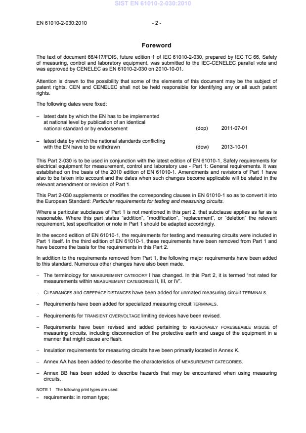 EN 61010-2-030:2010 is a standard published by CLC. Its full title is "Safety requirements for electrical equipment for measurement, control, and laboratory use - Part 2-030: Particular requirements for testing and measuring circuits". This standard covers: IEC 61010-2-030:2010 specifies safety requirements for testing and measuring circuits which are connected for test or measurement purposes to devices or circuits outside the measurement equipment itself. These include measurement circuits which are part of electrical test and measurement equipment, laboratory equipment, or process control equipment. The existence of these circuits in equipment requires additional protective means between the circuit and an OPERATOR. This Part 2-030 is to be used in conjunction with the latest edition of IEC 61010-1. It was established on the basis of the third edition (2010) of IEC 61010-1. Consideration may be given to future editions of, or amendments to, IEC 61010-1.