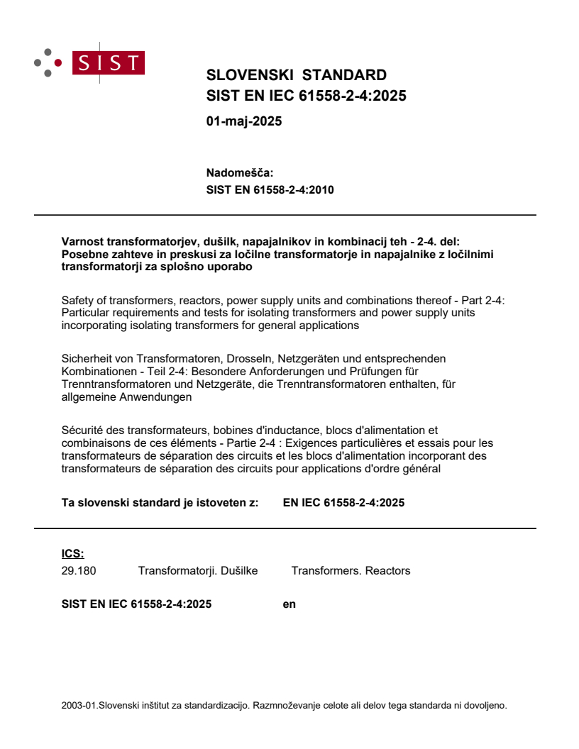 Overview - EN IEC 61558-2-4:2025 (Isolating transformers)