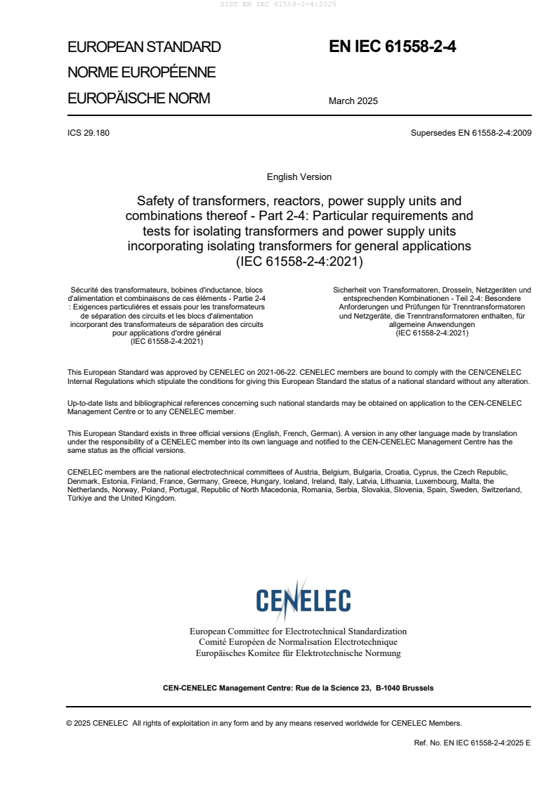 EN IEC 61558-2-4:2025 is the CLC-adopted European version of IEC 61558-2-4. It specifies particular safety requirements and tests for isolating transformers and power supply units that incorporate isolating transformers for general applications. This third edition updates and replaces the 2009 edition and is to be read together with EN IEC 61558-1 (general requirements and tests).