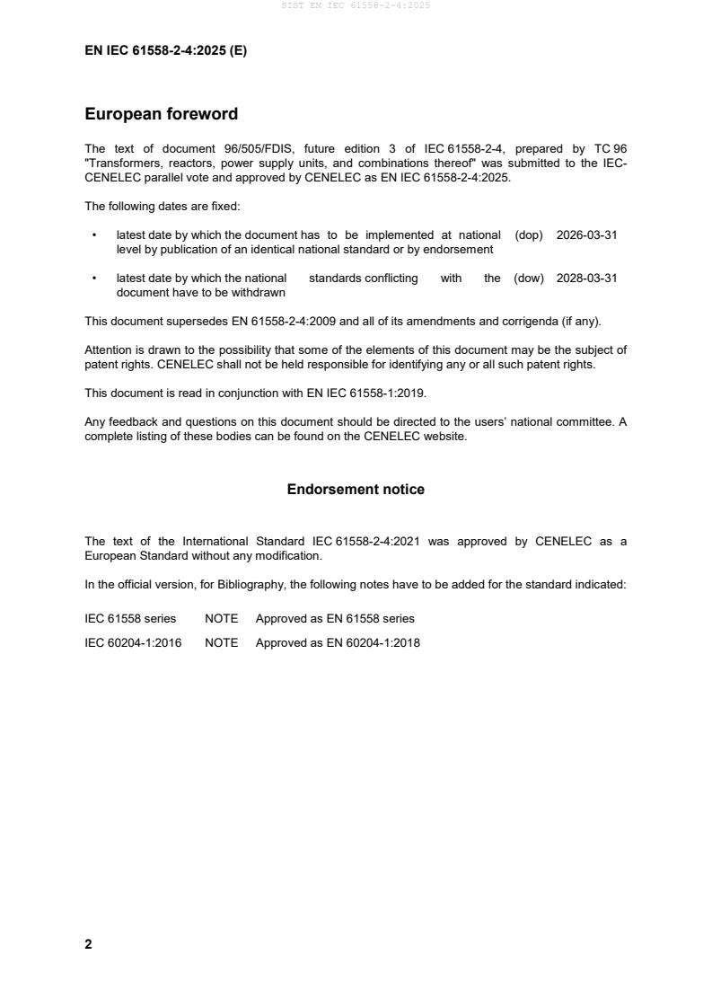EN IEC 61558-2-4:2025 is a standard published by CLC. Its full title is "Safety of transformers, reactors, power supply units and combinations thereof - Part 2-4: Particular requirements and tests for isolating transformers and power supply units incorporating isolating transformers for general applications". This standard covers: Replacement This part of IEC 61558 deals with the safety of isolating transformers for general applications and power supply units incorporating isolating transformers for general applications. Transformers incorporating electronic circuits are also covered by this document. NOTE 1 Safety includes electrical, thermal and mechanical aspects. Unless otherwise specified, from here onward, the term transformer covers isolating transformers for general applications and power supply units incorporating isolating transformers for general applications. For power supply units (linear) this document is applicable. For switch mode power supply units, IEC 61558-2-16 is applicable. This document is applicable to stationary or portable, single-phase or polyphase, air-cooled (natural or forced) independent or associated dry- type transformers. The windings can be encapsulated or non-encapsulated. The rated supply voltage does not exceed 1 000 V AC and the rated supply frequency and the internal operating frequencies do not exceed 500 Hz. The rated output does not exceed: - 25 kVA for single-phase transformers; - 40 kVA for polyphase transformers. This document is applicable to transformers without limitation of the rated output subject to an agreement between the purchaser and the manufacturer. NOTE 2 Transformers intended to supply distribution networks are not included in the scope. The no-load output voltage or the rated output voltage does exceed 50 V AC or 120 V ripplefree DC, and where applicable, does not exceed 500 V AC or 708 V ripple-free DC. The no-load output voltage and the rated output voltage may be up to 1 000 V AC or 1 415 V ripple-free DC for special applications. This document is not applicable to external circuits and their components intended to be connected to the input terminals and output terminals of the transformers. NOTE 3 Transformers covered by this document are used in applications where double or reinforced insulation between circuits is required by the installation rules or by the end product standard. Attention is drawn to the following: - additional requirements for transformers intended to be used in vehicles, on board ships, and aircraft (from other applicable standards, national rules, etc.); - measures to protect the enclosure and the components inside the enclosure against external influences such as fungus, vermin, termites, solar-radiation, and icing; - the different conditions for transportation, storage, and operation of the transformers; - additional requirements in accordance with other appropriate standards and national rules can be applicable to transformers intended for use in special environments. Future technological development of transformers can necessitate a need to increase the upper limit of the frequencies. Until then, this document may be used as a guidance document. This group safety publication focusing on safety guidance is primarily intended to be used as a product safety standard for the products mentioned in the scope, but is also intended to be used by TCs in the preparation of publications for products similar to those mentioned in the scope of this group safety publication, in accordance with the principles laid down in IEC Guide 104 and lSO/lEC Guide 51. One of the responsibilities of a TC is, wherever applicable, to make use of BSPs and/or GSPs in the preparation of its publications.
