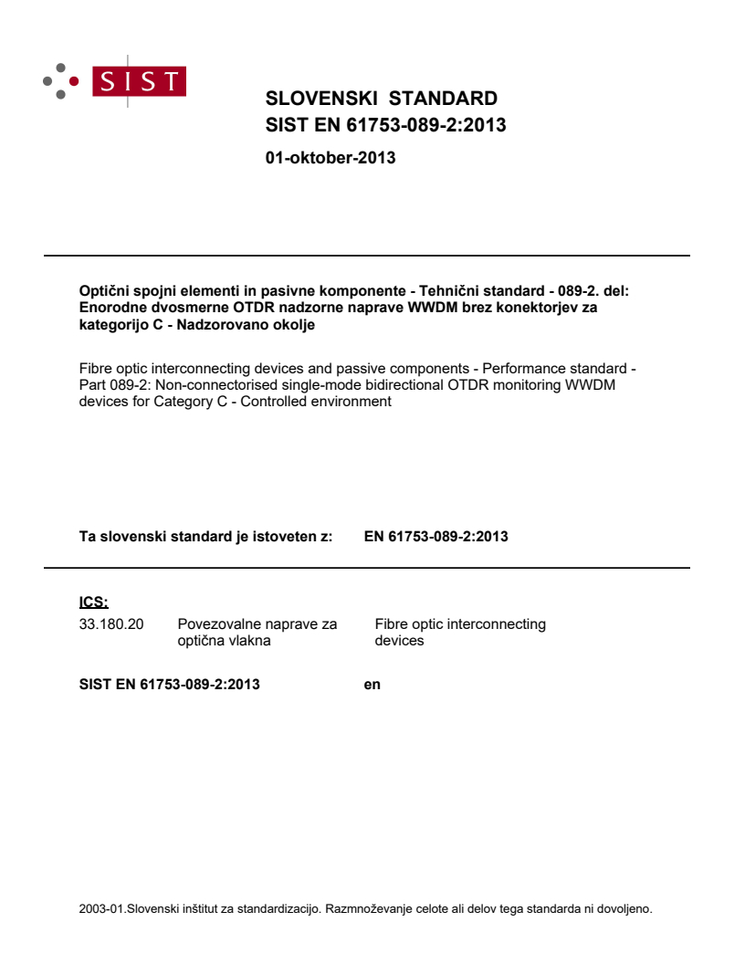 Optični spojni elementi in pasivne komponente - Tehnični standard - 089-2. del: Enorodne dvosmerne OTDR nadzorne naprave WWDM brez konektorjev za kategorijo C - Nadzorovano okolje