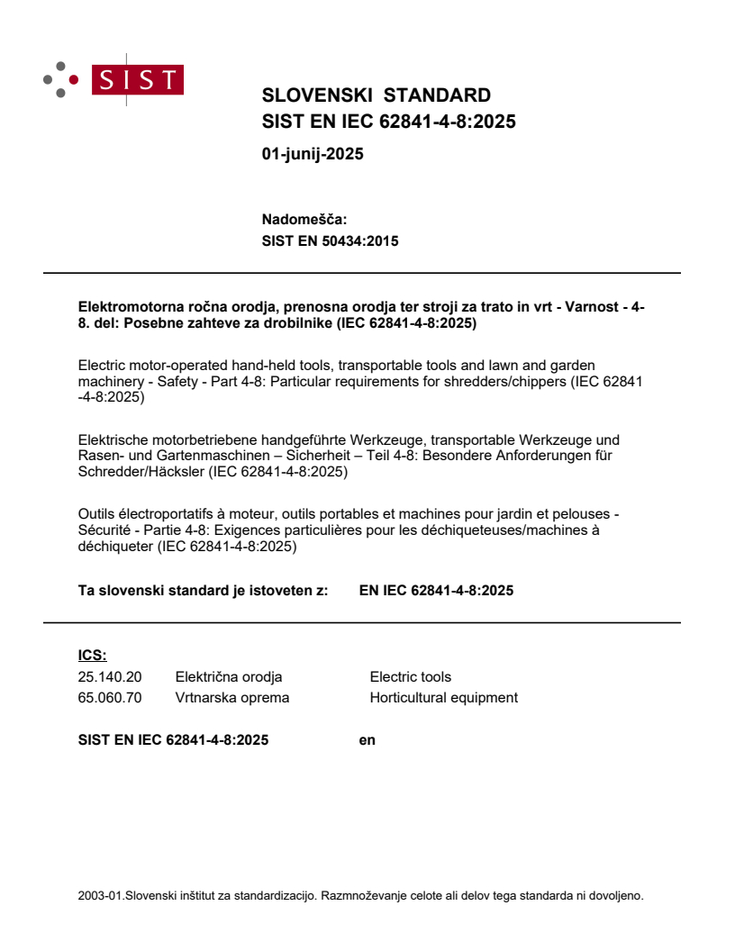 - Regional/adopted versions: EN IEC 62841‑4‑8:2025 / SIST EN IEC 62841‑4‑8:2025 (CENELEC adoption).