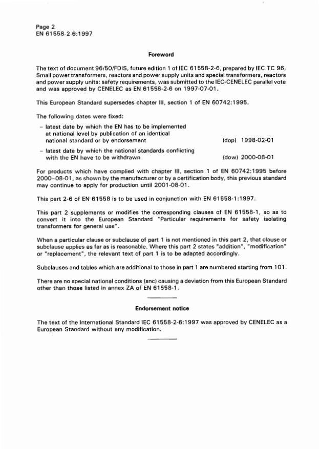 EN 61558-2-6:1997 is a standard published by CLC. Its full title is "Safety of power transformers, power supply units and similar - Part 2-6: Particular requirements for safety isolating transformers for general use". This standard covers: This part 2 of EN 61558 applies to stationary or portable, single-phase or polyphase, air-cooled safety isolating transformers associated or otherwise. It has the status of a group safety publication in accordance with IEC Guide 104. This part 2 supplements or modifies the corresponding clauses in EN 61558-1.