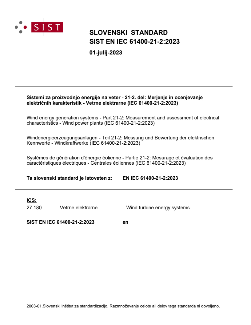 Standard IEC 61400-21-2 opredeljuje postopke merjenja in preskusne postopke za količinsko določanje električnih karakteristik kot osnovo za preverjanje skladnosti elektrarn, priklopljenih na omrežje, vključno s/z: