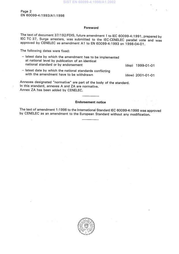 EN following parallel vote * Corrigendum to be issued taking into account DE & PT comments * Superseded by EN 60099-4:2004