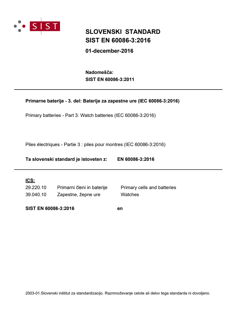 Primarne baterije - 3. del: Baterije za zapestne ure (IEC 60086-3:2016)