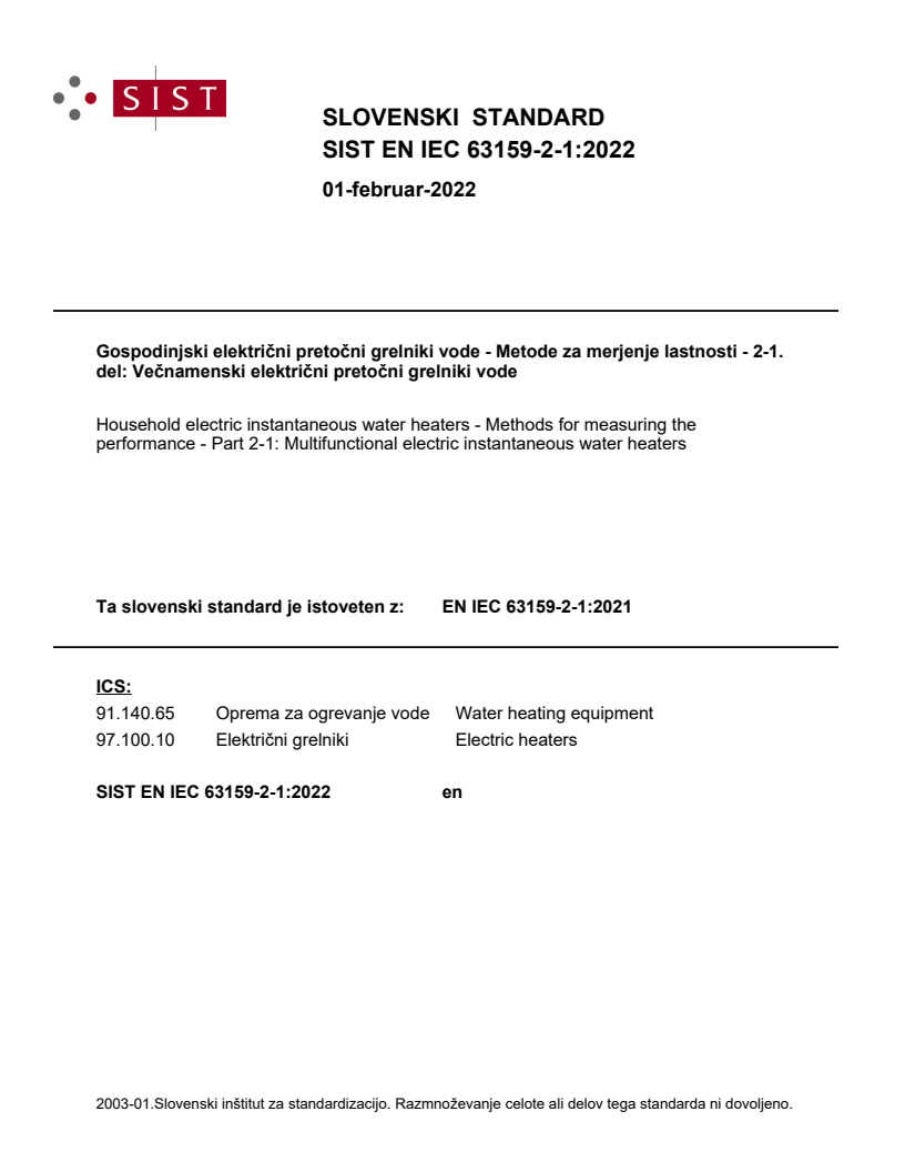 EN IEC 63159-2-1:2021 is a standard published by CLC. Its full title is "Household electric instantaneous water heaters - Methods for measuring the performance - Part 2-1: Multifunctional electric instantaneous water heaters". This standard covers: This clause of IEC 63159-1:2021 is applicable with the following exception: Addition: This document applies to electrical instantaneous water heaters designed to operate as multifunctional appliances with an electric rated power > 2 kW. This document specifies tests for the assessment of the performance.