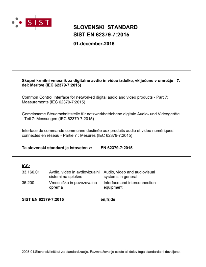 Skupni krmilni vmesnik za digitalne avdio in video izdelke, vključene v omrežje - 7. del: Meritve (IEC 62379-7:2015)