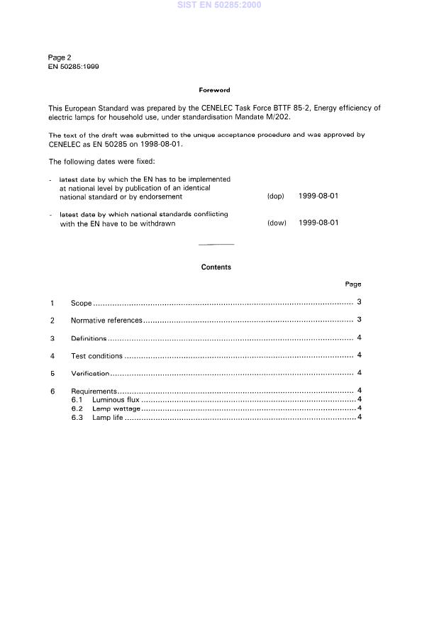 EN 50285:1999 is a standard published by CLC. Its full title is "Energy efficiency of electric lamps for household use - Measurement methods". This standard covers: This European Standard has been produced under Standardisation Mandate M/202 in response to the European Commission Directive implementing Council Directive 92/75/EEC with regard to energy labeling of household lamps. A method of classification of lamps according to energy efficiency is given in the directive and is not a part of this standard. This standard specifies the test conditions and method of measurement of luminous flux, lamp wattage and lamp life as given on a label on the lamp packaging, together with a procedure for verification of the declared values. Only those parameters that are specific to the above mentioned Directive are included in this standard. All other parameters are included in the relevant lamp performance standards. Lamps covered by this standard are: mains voltage tungsten filament lamps; mains voltage tungsten halogen lamps; self-ballasted lamps; double-capped fluorescent lamps; single-capped fluorescent lamps