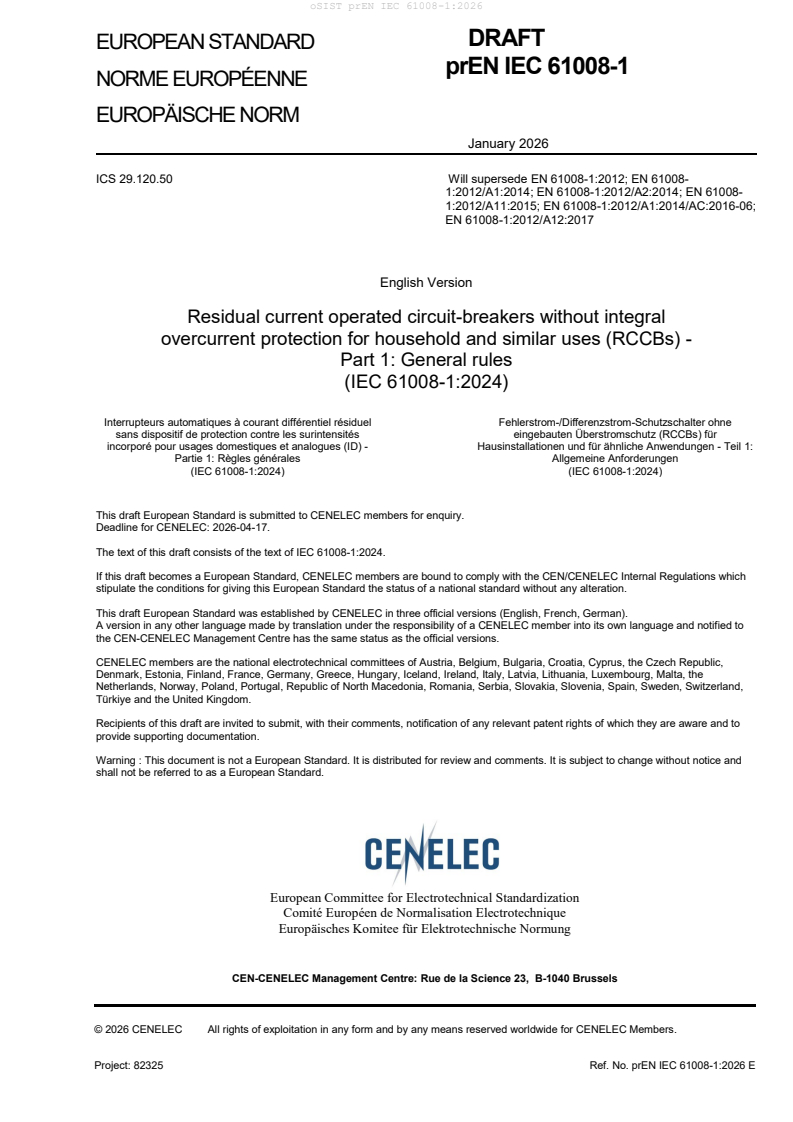 prEN IEC 61008-1:2026 is a draft published by CLC. Its full title is "Residual current operated circuit-breakers without integral overcurrent protection for household and similar uses (RCCBs) - Part 1: General rules". This standard covers: This document gives general requirements and tests for residual current operated circuit-breakers without integral overcurrent protection for household and similar uses (hereafter referred to as RCCBs), for rated operational voltages not exceeding 440 V AC, with rated frequencies of 50 Hz, 60 Hz or 50/60 Hz and rated currents not exceeding 125 A, intended principally for protection against shock hazard. RCCBs are intended to provide fault protection (previously referred to as protection against indirect contact), the exposed conductive parts of the installation being connected to an appropriate earth electrode. They are also intended to be used to provide protection against fire hazards due to a persistent earth fault current. RCCBs having a rated residual operating current not exceeding 30 mA are used for fault protection and additional protection in the case of failure of the protective provisions against electric shock. This document applies to RCCBs performing simultaneously the functions of detection of the residual current, of comparison of the value of this current with the residual operating value and of opening of the protected circuit when the residual current exceeds this value. RCCBs are intended to be operated by ordinary or uninstructed persons and designed not to require maintenance. The requirements of this document apply for standard conditions (see 7.1). Additional requirements can be necessary for RCCBs used in locations which have severe environmental conditions. RCCBs within the scope of this document are intended for use in an environment with pollution degree 2 (see 7.3). RCCBs are suitable for isolation. Special precautions (e.g. surge protective devices) can be necessary when excessive overvoltages are likely to occur on the supply side (for example in the case of supply through overhead lines, see IEC 60364-4-44 and IEC 60364-5-53). RCCBs, with the exception of those with an uninterrupted neutral, are suitable for use in IT systems. RCCBs of the general type are resistant to current surges, including the case where surge voltages (as a result of switching transients or induced by lightning) cause loading currents in the installation without occurrence of flashover. RCCBs of type S are considered to be sufficiently resistant against unwanted tripping even if the surge voltage causes a flashover and a follow-on current occurs. Particular requirements are necessary for RCCBs intended to be used at frequencies other than 50 Hz or 60 Hz. For RCCBs incorporated in, or intended for association with socket-outlets only, the requirements of this document can be used, as far as applicable, in conjunction with the requirements of IEC 60884-1 or the national requirements of the country where the product is placed on the market. This document does not apply to: – RCCBs the current setting of which is adjustable without a tool; – RCCBs including batteries. This document is not intended to be used alone; it is intended to be used in conjunction with the relevant product standard, IEC 61008-2-1 or IEC 61008-2-2.