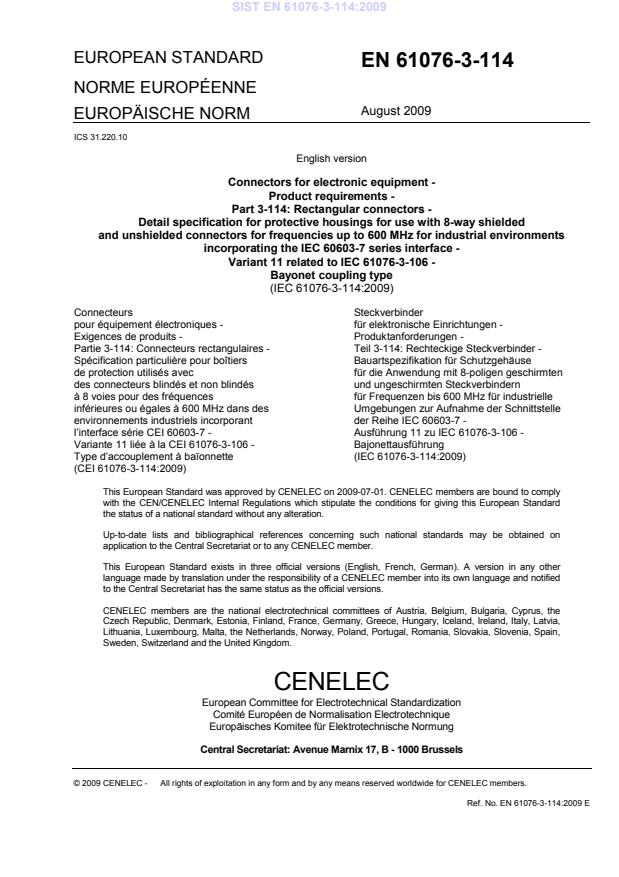 EN 61076-3-114:2009 is a standard published by CLC. Its full title is "Connectors for electronic equipment - Product requirements - Part 3-114: Rectangular connectors - Detail specification for protective housings for use with 8-way shielded and unshielded connectors for frequencies up to 600 MHz for industrial environments incorporating the IEC 60603-7 series interface - Variant 11 related to IEC 61076-3-106 - Bayonet coupling type". This standard covers: IEC 61076-3-114:2009 covers protective housings for upgrading existing 8-way shielded and unshielded connectors utilizing the interface described in IEC 60603-7-2, IEC 60603-7-3, IEC 60603-7-4, IEC 60603-7-5, and IEC 60603-7-7 to IP65 and IP67 ratings, according to IEC 60529, for use in industrial environments. The housings cover a variety of different locking mechanisms and a variety of different mounting configurations and termination types which are detailed in IEC 60603-7.