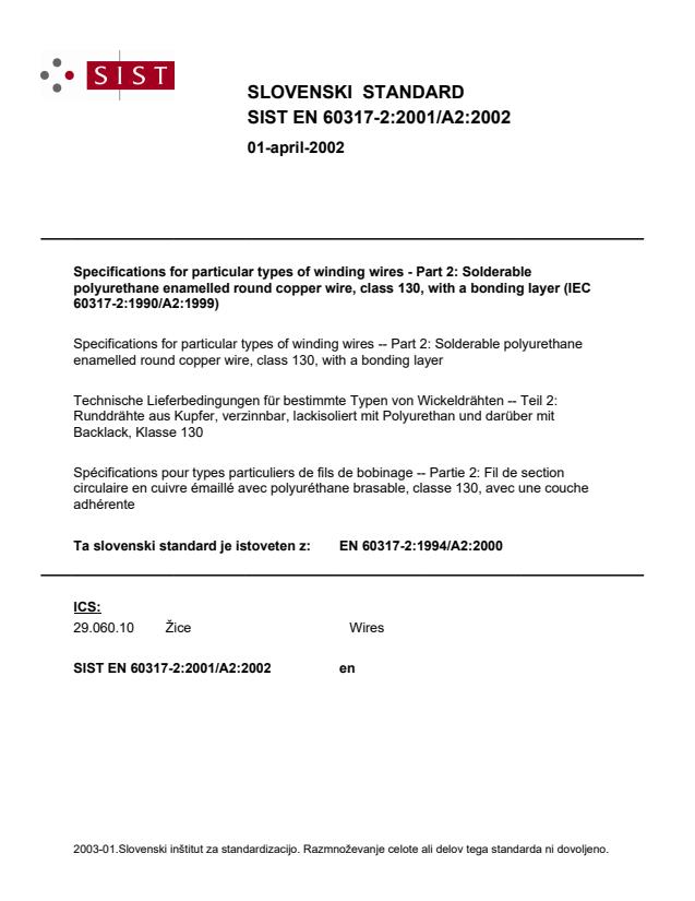 EN 60317-2:1994/A2:2000 is a amendment published by CLC. Its full title is "Specifications for particular types of winding wires - Part 2: Solderable polyurethane enamelled round copper wire, class 130, with a bonding layer". This standard covers: Superseded by EN 60317-2:2012 withdrawn by D145/C012