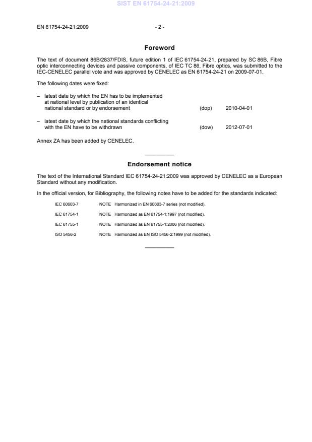 2012-07-01 Annex ZA has been added by CENELEC. __________ Endorsement notice The text of the International Standard IEC 61754-24-21:2009 was approved by CENELEC as a European Standard without any modification. In the official version, for Bibliography, the following notes have to be added for the standards indicated: IEC 60603-7 NOTE