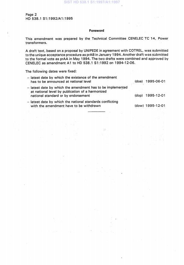 HD 538.1 S1:1992/A1:1995 is a amendment published by CLC. Its full title is "Three-phase dry-type distribution transformers 50 Hz, from 100 to 2500 kVA, with highest voltage for equipment not exceeding 36 kV - Part 1: General requirements and requirements for transformers with highest voltage for equipment not exceeding 24 kV". This standard covers: HD 538.1 S1:1992 + A1:1995 and HD 538.2 S1:1995 will be superseded by future EN 50541-1 (PR=14820)