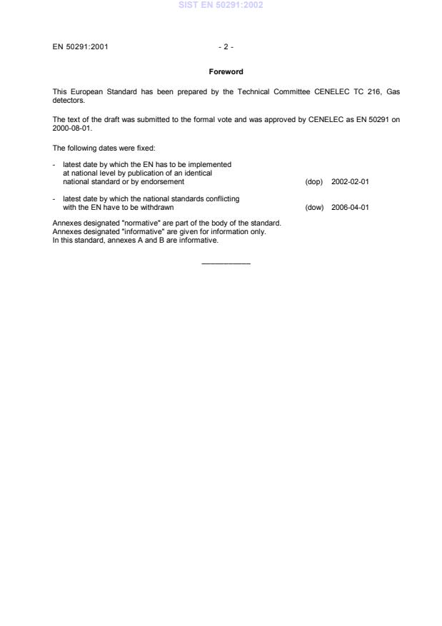 - 3 - EN 50291:2001Contents1Scope.42Normative references.43Definitions.54General requirements.64.1General.64.2Construction.64.3Indicators and alarms.74.4Fault signals.84.5Output signal (applicable for type A apparatus only).84.6Labelling and instructions.85Test and performance requirements.95.1General requirements for tests.95.2Normal conditions for tests.105.3Test methods and performance requirements.116Self-contained battery powered apparatus.176.1Battery fault warning.176.2Battery capacity.176.3Battery reversal.186.4Battery connections.18Annex A