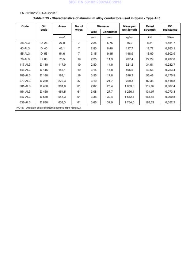 Corrigendum to EN 50182:2001 English version ___________ 1 Modifications due to the Corrigendum from June 2005: Subclause 5.6.5 In table 3, replace "" by "≤" so as to have it read: Table 3 - Number of joints permitted in a given length Conductor length L (m) Number of joints permitted Number of aluminium layers 1 2 3 4 L ≤ 1 500 1 500 < L ≤ 2 000 L > 2 000 - - - - - - - - L ≤ 1 500 1 500 < L ≤ 2 000 2 000 < L ≤ 2 500 L > 2 500 - - - - - - - L ≤ 1 500 1 500 < L ≤ 2 000 2 000 < L ≤ 2 500 2 500 < L ≤ 3 000 3 000 < L ≤ 3 500 L > 3 500 - - - - - L ≤ 1 500 1 500 < L ≤ 2 000 2 000 < L ≤ 2 500 2 500 < L ≤ 3 000 3 000 < L ≤ 3 500 3 500 < L ≤ 4 000 L > 4 000 2 3 4 5 6 7 8 9 10 11 Subclause 5.10 In the first line replace "/km" by "Ω/km". Annex B, clause B.3 In the equations for Case 1, Case 2, Case 3 and Case 4 (two instances), replace "" by "π". Annex F, clause F.1 Replace "F.1 to F.48" by "F.1 to F.52". Replace tables F.29 and F.31 as given below. Add the new tables F.49 to F.52.
