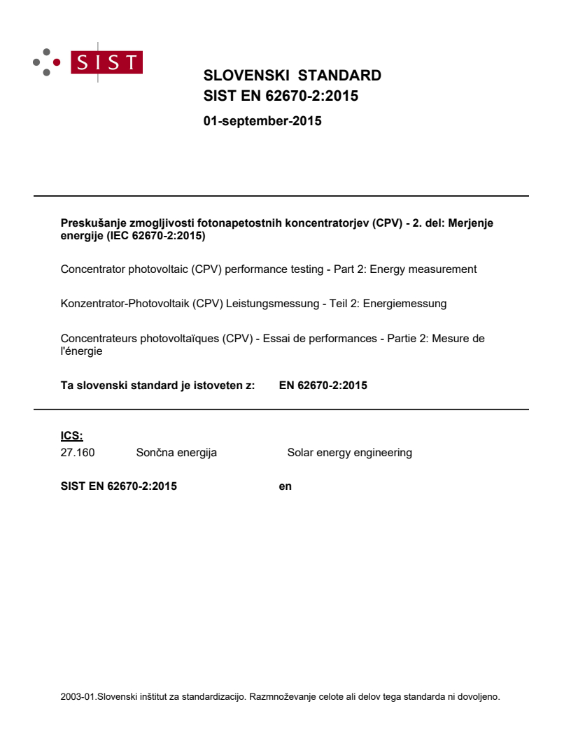 Preskušanje zmogljivosti fotonapetostnih koncentratorjev (CPV) - 2. del: Merjenje energije (IEC 62670-2:2015)