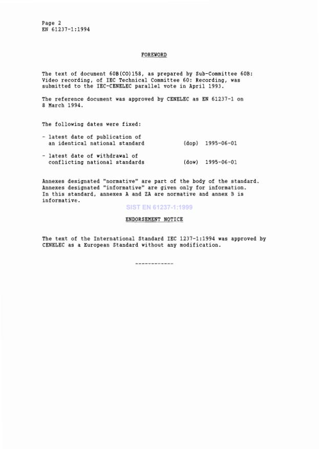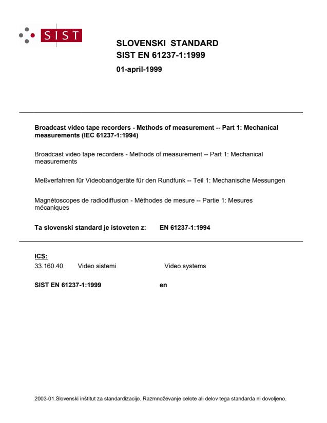 Keywords: EN 61237-1:1994, IEC 61237-1, broadcast video tape recorders, mechanical measurements, VTR test methods, tape speed, track pitch, video reference point, drum geometry, head gap, track geometry.