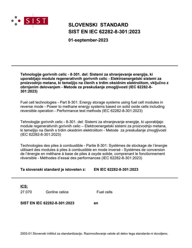 Standard IEC 62282-8-301:2023 določa metode za preskušanje zmogljivosti elektroenergetskih sistemov za proizvodnjo metana, ki temeljijo na členih s trdim oksidnim elektrolitom (SOC). V sistem se dovajajo voda, CO2 in elektrika, da proizvaja metan in kisik.
