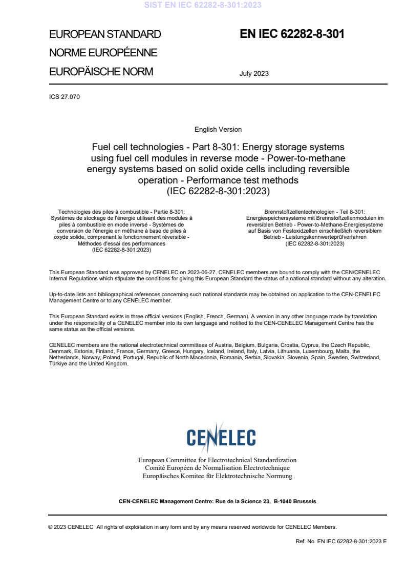 Keywords: EN IEC 62282-8-301:2023, power-to-methane, solid oxide cells, performance test methods, fuel cell technologies, energy storage systems, methanation reactor, reversible operation.