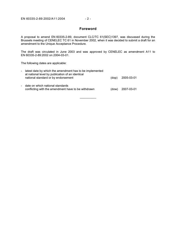 This amendment A11 modifies the European Standard EN 60335-2-89:2002; it was approved by