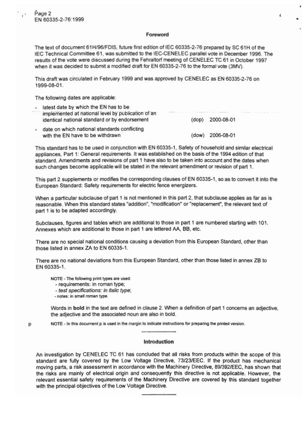 EN 60335-2-76:1999 is a standard published by CLC. Its full title is "Safety of household and similar electrical appliances - Part 2-76: Particular requirements for electric fence energizers". This standard covers: Deals with the safety of electric fence energizers for agricultural, feral animal control and security fences. This includes mains-operated and battery-operated energizers.