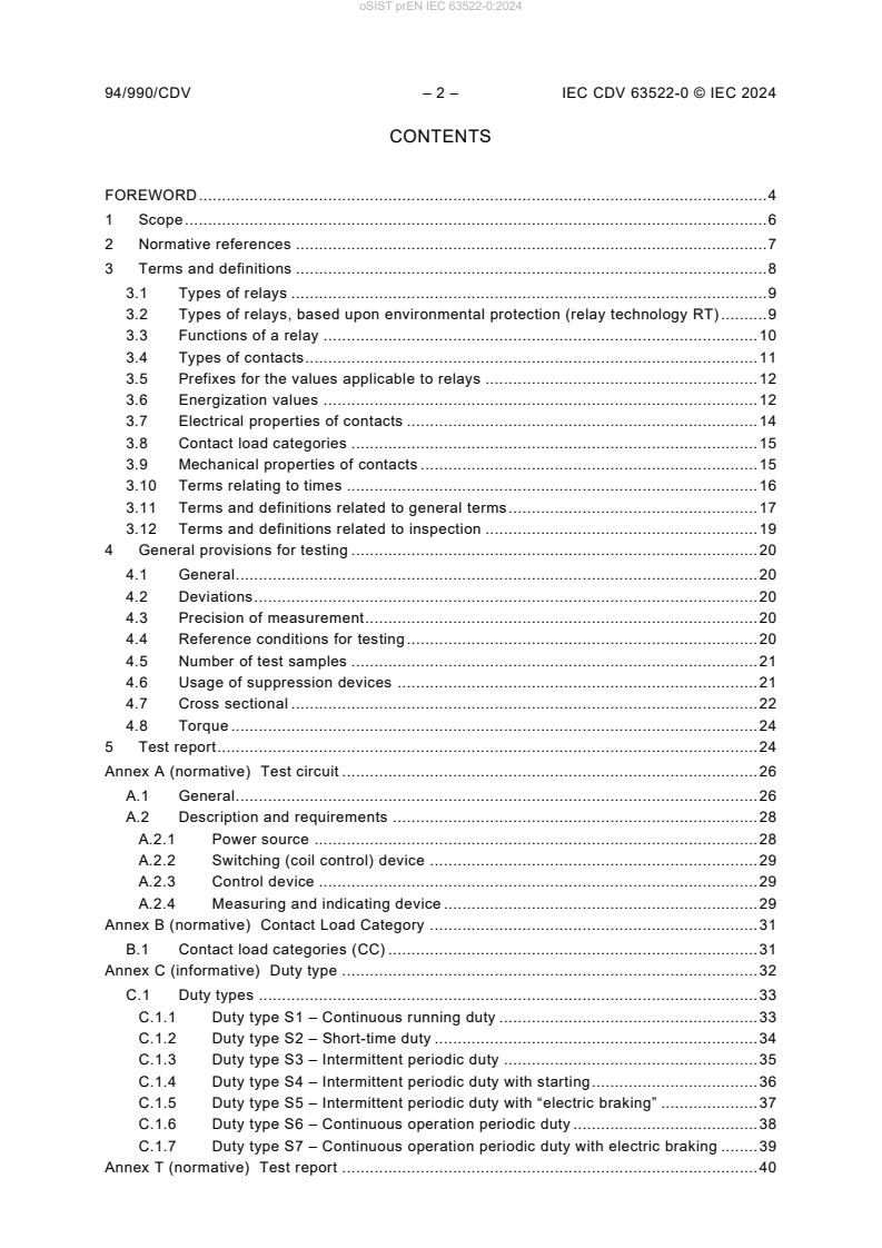 prEN IEC 63522-0:2025 outlines methods for testing electrical relays to evaluate their capability to perform in transportation, storage, and operational environments. It specifies the general conditions, severities, and measurement criteria to be applied consistently across the series.Terminology and Definitions: