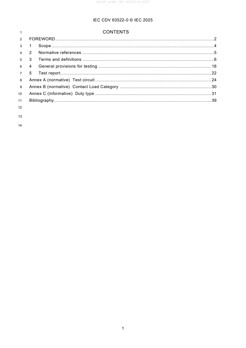 The document sets the groundwork for subsequent parts of the 63522 series, specifying general testing principles and how to compile test reports. It includes normative annexes with detailed test circuits and contact load categories.Normative References: