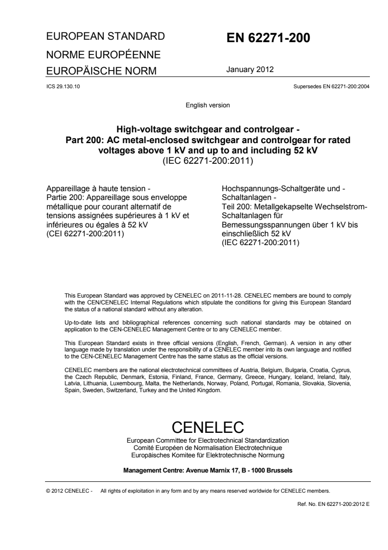 EN 62271-200:2012 is a standard published by CLC. Its full title is "High-voltage switchgear and controlgear - Part 200: AC metal-enclosed switchgear and controlgear for rated voltages above 1 kV and up to and including 52 kV". This standard covers: IEC 62271-200:2011 specifies requirements for prefabricated metal enclosed switchgear and controlgear for alternating current of rated voltages above 1 kV and up to and including 52 kV for indoor and outdoor installation, and for service frequencies up to and including 60 Hz. Enclosures may include fixed and removable components and may be filled with fluid (liquid or gas) to provide insulation. This second edition cancels and replaces the first edition, published in 2003. It is a technical revision. This second edition of IEC 62271-200 has been further updated and improved to the experience gained with the first edition of IEC 62271-200. As maintenance result, this second edition of IEC 62271-200 introduces the following significant changes: - definitions, classifications and testing procedures are specified more precisely; - categories LSC2A and LSC2B have been clarified and LSC2 has been assigned a separate definition; - specific ratings related to fault level to earth (4.5 to 4.7) are introduced; - solid insulated high-voltage parts are no longer considered as compartments on their own; - an optional rating 'cable test voltage' and the associated requirements and type tests are introduced; - for testing the internal arc classification, when assigned by the manufacturer, more specific guidance is provided regarding the test arrangement, room simulation and arc initiation; - a single phase to earth ignition is also recognised for internal arc testing; - the Annexes A and B are renumbered Annexes AA and BB. This publication is to be read in conjunction with IEC 62271-1:2007.