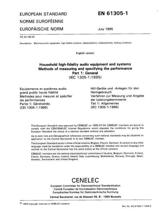 EN 61305-1:1995, titled Household High-Fidelity Audio Equipment and Systems - Methods of Measuring and Specifying the Performance - Part 1: General, is an international standard developed by the International Electrotechnical Commission (IEC) and adopted by the CLC. It exclusively applies to household high-fidelity (hi-fi) audio equipment and systems, providing fundamental principles and general assumptions for measuring and specifying performance characteristics. The standard serves as a foundational framework to ensure consistent, transparent, and internationally harmonized methods for evaluating audio equipment quality.