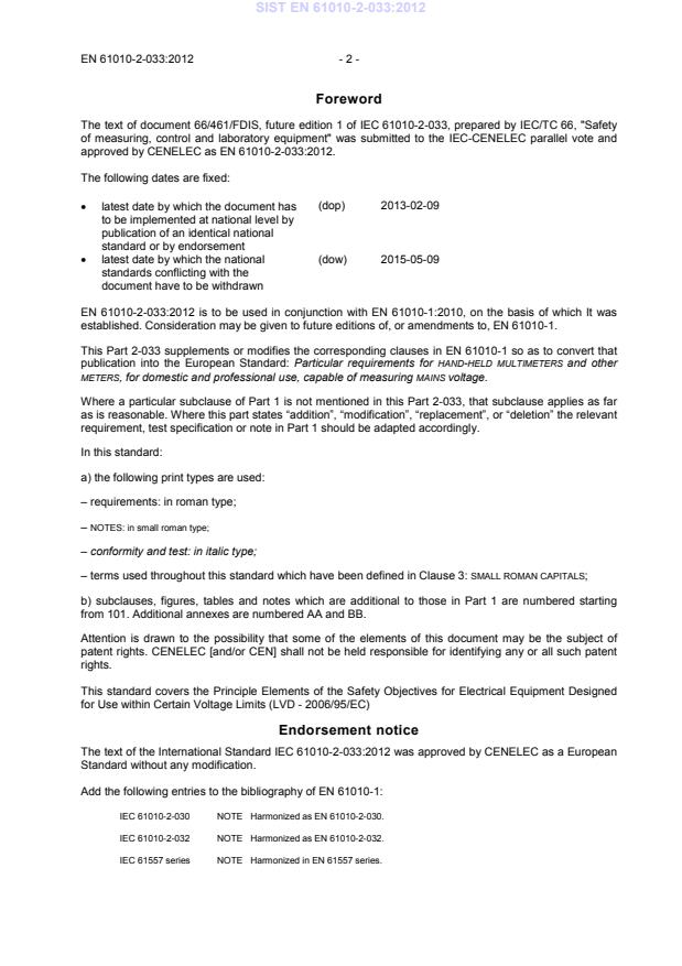 Ta točka 1. dela se uporablja, razen kot sledi: 1.1.1 Oprema, zajeta v področje uporabe Nadomestilo: Obstoječe besedilo se zamenja z naslednjim: Ta del standarda IEC 61010 določa varnostne zahteve za MERILNIKE. MERILNIKI z glavnim namenom merjenja napetosti OMREŽNEGA TOKOKROGA pod napetostjo spadajo v področje uporabe tega standarda. Čeprav imajo različne nazive, se z vsemi merilniki lahko meri napetost OMREŽNEGA TOKOKROGA pod napetostjo. Med nazive za to opremo spadajo: – MULTIMETER, – digitalni MULTIMETER, – VOLTMETER, kleščni MERILNIK (glejte tudi 2-032. del). Izraz MERILNIK se za namene tega standarda uporablja za te ROČNE merilne instrumente. OPOMBA: Za dele opreme, ki ne spadajo v področje uporabe 2-033. dela, se šteje, da so zajeti v zahtevah 1. dela ali drugih 2. delov standarda IEC 61010, poleg tega bodo morali izpolnjevati tudi zahteve drugih delov. 1.1.2 Oprema, izključena iz področja uporabe Dodatek: Na seznam se doda naslednji novi element: aa) standard IEC 61557 (Električna varnost v nizkonapetostnih razdelilnih sistemih izmenične napetosti do 1 kV in enosmerne napetosti do 1,5 kV – Oprema za preskušanje, merjenje ali nadzorovanje zaščitnih ukrepov – 1. do 12. del). Dodatek: Za točko se dodata naslednja odstavka: Oprema, ki ne omogoča merjenja OMREŽNE napetosti, ne spada v področje uporabe 2-033.dela. Zahteve v zvezi s takšno opremo so navedene v standardu IEC 61010-2-030. 61010-2-033 ? IEC:2012 – 7 – Takšna oprema, vključno z drugo ROČNO opremo, kot so osciloskopi, vatmetri, MULTIMETRI za kontrolo procesa in oprema za preskušanje komunikacij, ne spada v področje uporabe 2-033. dela. 1.2.1 Vidiki, zajeti v področje uporabe Dodatek: Za točko se doda naslednji odstavek: Zahteve za zaščito pred NEVARNOSTMI, ki izhajajo iz OBIČAJNE UPORABE in RAZUMNO PREDVIDENE NEPRAVILNE UPORABE merilnih vezij, so navedene v točki 101.