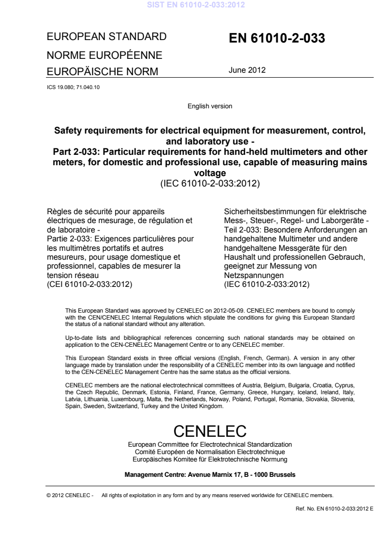 EN 61010-2-033:2012 is a standard published by CLC. Its full title is "Safety requirements for electrical equipment for measurement, control, and laboratory use - Part 2-033: Particular requirements for hand-held multimeters and other meters, for domestic and professional use, capable of measuring mains voltage". This standard covers: IEC 61010-2-033:2012 specifies safety requirements for METERS. The METERS that have a primary purpose of measuring voltage on a live MAINS CIRCUIT are within the scope of this standard. They have various names, but all of them have capability for measurements of voltages on a live MAINS CIRCUIT. Some of the names given to this equipment are as follows: - MULTIMETER; - digital MULTIMETER; - VOLTMETER; - clamp METER (see also Part 2-032). For the purpose of this standard, the term METER is used for these HAND-HELD measuring instruments.