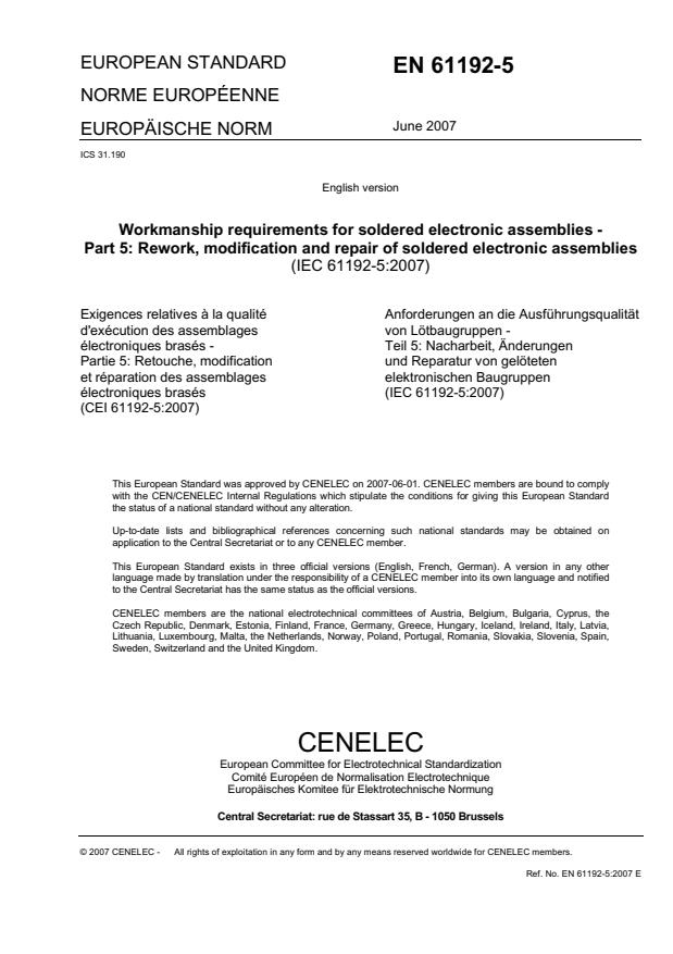 EN 61192-5:2007 is a standard published by CLC. Its full title is "Workmanship requirements for soldered electronic assemblies - Part 5: Rework, modification and repair of soldered electronic assemblies". This standard covers: IEC 61192-5:2007 provides information and requirements that are applicable to modification, rework and repair procedures for soldered electronic assemblies. It is applicable to specific processes used to manufacture soldered electronic assemblies where components are attached to printed boards and to the relevant parts of resulting products. The standard is also applicable to activities that can form part of the work in assembling mixed technology products. It also contains guidance on design matters where they have relevance to rework.